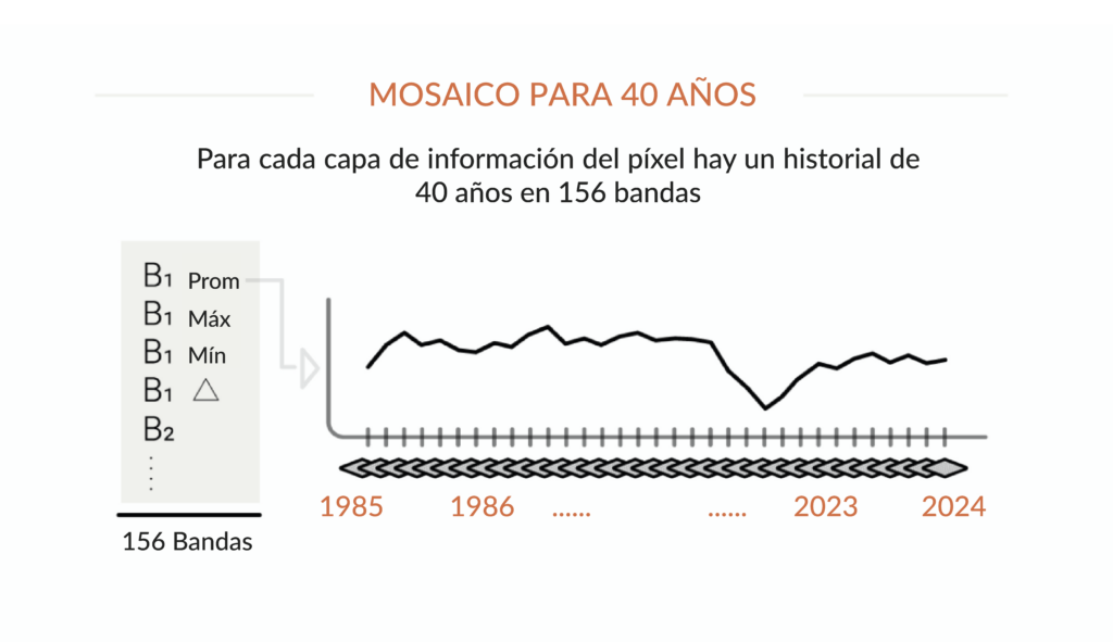 Para cada año se crean mosaicos que cubren toda Colombia, representando el comportamiento de cada píxel a través de 156 capas de información. Este conjunto de mosaicos se guardan como una colección de datos (ASSET) dentro de la plataforma Google Earth Engine. Los mosaicos se utilizan para diversos fines, por ejemplo: