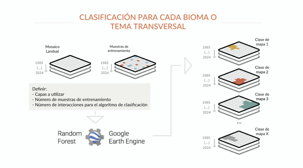 A partir de los mosaicos, los equipos de cada bioma y de cada tema transversal elaboran un mapa de cada clase de cobertura y uso del suelo (Bosque natural, Formación herbácea, Área urbana, Cuerpos de agua, etc.). Para ello, los analistas de MapBiomas utilizan un clasificador automático fundamentado en el algoritmo Random Forest, el cual se ejecuta en la nube de procesadores de Google. Este sistema se apoya en un enfoque de aprendizaje semiautomático, donde se entrena un modelo para generar clasificaciones supervisadas a partir de muestras de entrenamiento específicas para cada mapa propuesto. Estas muestras se obtienen a través de mapas de referencia, generación de mapas de clases estables, y por recolección directa por interpretación visual realizada sobre las imágenes Landsat. La clasificación se realiza en cada uno de los años de la serie, y se puede visualizar por clase donde cada píxel tiene un número de capas correspondiente al número de años de la serie histórica analizada.