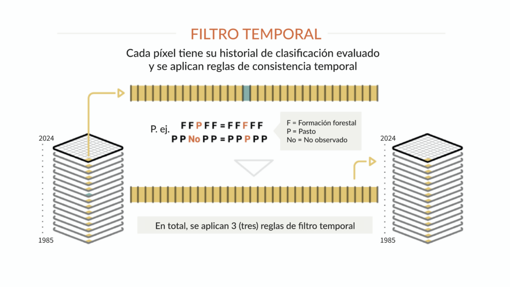 Para reducir las inconsistencias temporales, especialmente los cambios imposibles o no permitidos en la cobertura y el uso (por ejemplo, Bosque natural > No bosque > Bosque natural) y corregir las fallas debido al exceso de nubes o falta de datos, se aplican reglas de filtro temporal. Cada bioma, tema o región puede tener reglas de filtro temporal específicas. En total en la Colección 3 se aplicaron 3 reglas. El filtro temporal se aplica a cada píxel analizando todos los años de la Colección (40 años).