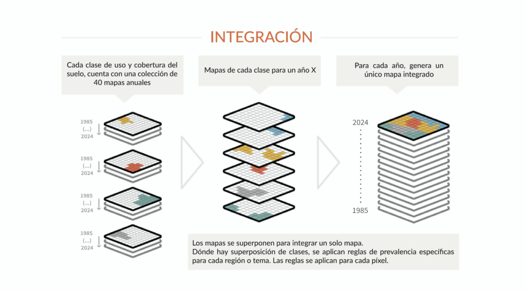 En este paso, los mapas de cada clase se integran en un solo mapa que representa la cobertura y uso de suelo de todo el territorio para cada año. Se aplican reglas de prevalencia: de esta manera, si un mismo píxel se clasifica en dos mapas de clases diferentes, es posible definir a cuál pertenece en el mapa final. Las reglas de prevalencia pueden variar según las peculiaridades de los temas o regiones. La integración se realiza para cada año de la serie y genera un mapa integrado para cada año, generalmente guardado como un único ASSET con el número de capas anuales del período analizado. El mapa integrado pasa por un paso más de filtro espacial para limpiar los bordes y los píxeles sueltos como resultado del proceso de integración.