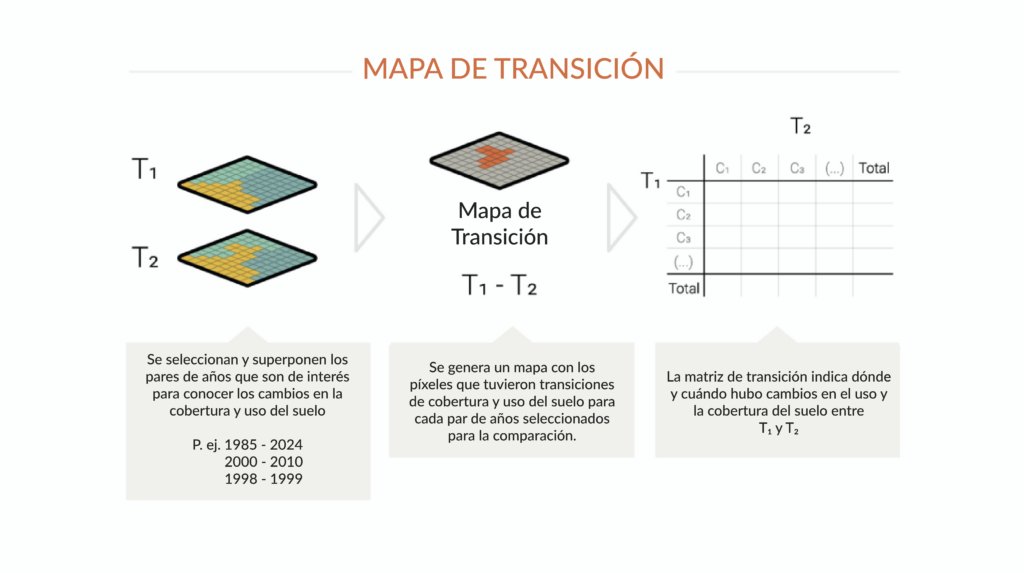 Para comprender los cambios en la cobertura y el uso del suelo, se producen mapas con transiciones de clase entre diferentes pares de años seleccionados. Así, es posible visualizar el dinamismo del territorio, y responder preguntas como cuánto del bosque se ha convertido en mosaico de agricultura y/o pasto de un año a otro, por ejemplo, entre otros cambios en el paisaje. Los mapas de transición se producen píxel a píxel y, una vez finalizados, también se someten a un filtro espacial para eliminar los píxeles de transición aislados o de borde. A partir de estos mapas se construyen matrices de transición para cada región, estado, municipio y demás tramos territoriales disponibles en la plataforma MapBiomas Colombia.
